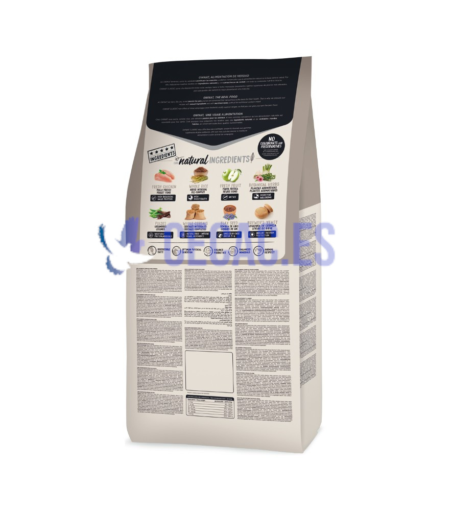 Carnes 35% (carnes deshidratadas 25%, pollo fresco* 10% antes de la extrusión), trigo integral* (21%), maíz integral (10%), cebada integral* (9%), arroz integral* (7%), salvado de trigo* (6%), garrofa* (2%), guisantes enteros* (2%), grasa de pollo, manzana (1%), aceite de salmón, semilla de lino* (1%), pulpa de remolacha, proteína hidrolizada de pollo, fruto y manano oligosacáridos, levadura de cerveza* (0,5%), plantas aromáticas 0,02% (hinojo*, equinácea*, tomillo*), yuca schidigera. CON INGREDIENTES NATURALES