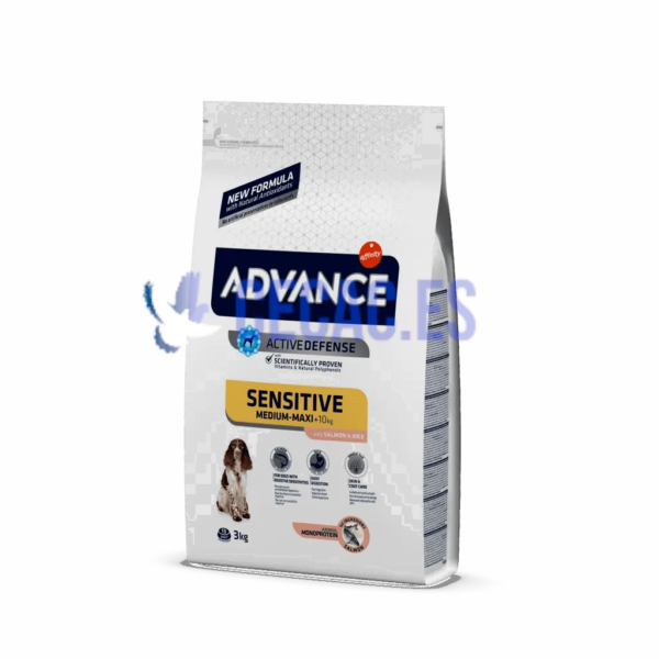 ADVANCE Sensitive Medium/Maxi (+10 kg) es un alimento completo y equilibrado especialmente formulado para perros con sensibilidad digestiva. La sensibilidad digestiva puede manifestarse a través malas digestiones y de forma ocasional a través de síntomas cutáneos.