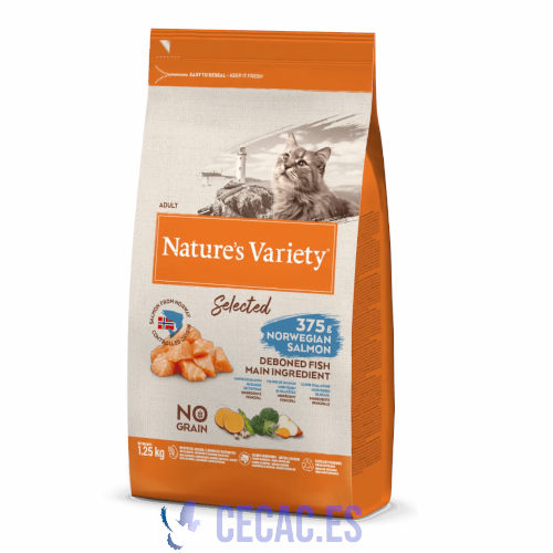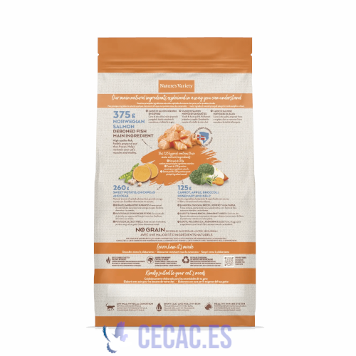 Carne de salmón noruego sin espinas* (30%), proteína deshidratada de atún (13%), proteína de patata, almidón de guisante*, boniato deshidratado* (4%), hidrolizado de proteína (3%), zanahoria deshidratada* (0,5%, equivalente a un 4% de zanahoria fresca), brócoli deshidratado* (0,5%, equivalente a un 4% de brócoli fresco), manzana deshidratada* (0,3%, equivalente a un 2% de manzana fresca), alga marina deshidratada* (0,01%), romero deshidratado* (0,01%)., *Ingredientes naturales.