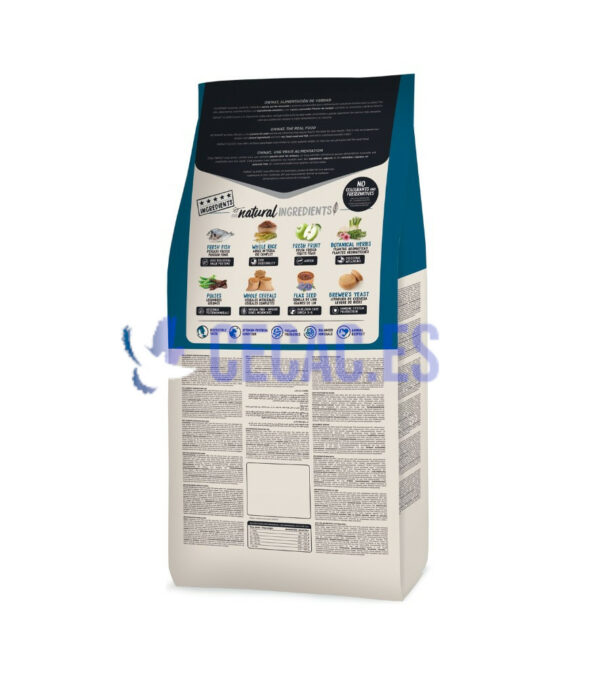 Carnes deshidratadas 18%, pescado 15% (pescado fresco* 10% antes de la extrusión, pescado deshidratado 5%), trigo integral* (12%), cebada integral* (12%), grasa de pollo, salvado de trigo* (9%), maíz integral* (9%), arroz integral* (6%), guisantes enteros* (3%), manzana* (1%), aceite de salmón, semilla de lino* (1%), pulpa de remolacha, fruto y manano oligosacáridos, levadura de cerveza* (0,5%), plantas aromáticas 0,02% (hinojo*, equinácea*, tomillo*), yuca schidigera. CON INGREDIENTES NATURALES.