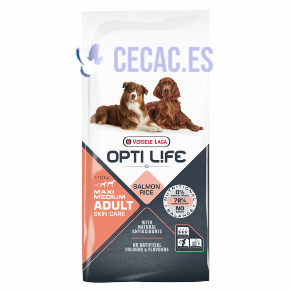 Opti Adult Skin Care Medium & Maxi para razas medianas y grandes (>10 kg) es una fórmula perfectamente equilibrada desde el punto de vista nutricional a base de salmón y arroz que hará que la piel y el pelo de su perro irradien salud.