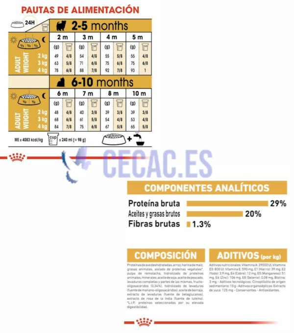 proteínas de ave deshidratadas, arroz, harina de maíz, grasas animales, aislado de proteínas vegetales*, pulpa de remolacha, hidrolizado de proteínas animales, minerales, aceite de soja, aceite de pescado, levaduras completas y partes de las mismas, fructo-oligosacáridos (0,34%), hidrolizado de levaduras (fuente de manano-oligosacáridos), aceite de borraja, extracto de levaduras (fuente de betaglucanos), extracto de rosa de la India (fuente de luteína).