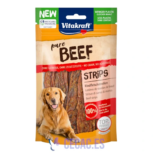100 % tiras de ternera, preparadas a base de pura carne.  Sin azúcar, soja, trigo, huevo, ni productos lácteos añadidos.  Sin harinas a base de carne.  Un snack perfecto que aporta una porción extra de proteínas.  Sin colorantes ni potenciadores artificiales del sabor.