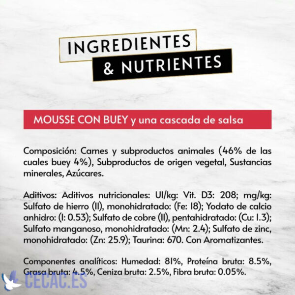 Una sofisticada selección de delicias sublimes perfectamente elaboradas en pirámides de 57g, para desvelar una comida húmeda para gatos exquisita y toda una experiencia culinaria.Cada refinada y delicada mousse está preparada con ingredientes de alta calidad y con una cascada de deliciosa salsa para ofrecer a tu gato una exquisita experiencia culinaria. GOURMET REVELATIONS, mousse con buey. Un ritual culinario único.