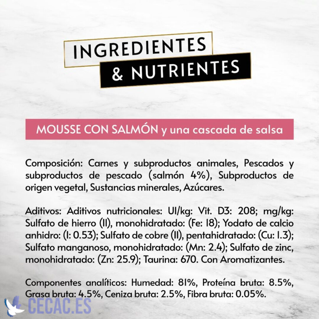 Una sofisticada selección de delicias sublimes perfectamente elaboradas en pirámides de 57g, para desvelar una comida húmeda para gatos exquisita y toda una experiencia culinaria. Cada refinada y delicada mousse está preparada con ingredientes de alta calidad y con una cascada de deliciosa salsa para ofrecer a tu gato una exquisita experiencia culinaria. GOURMET REVELATIONS, mousse con salmón. Un ritual culinario único.