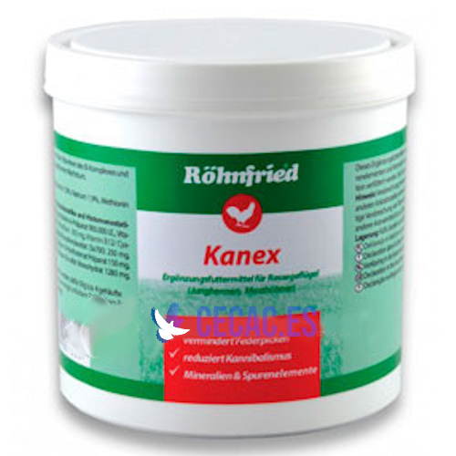 - Kanex de Rohnfried es un producto 100% natural, especialmente indicado para evitar que los pájaros se coman sus propias plumas (en especial, las del buche) debido a una falta de minerales, aminoácidos.