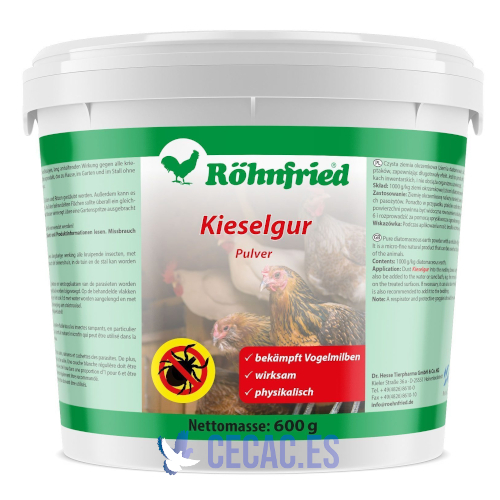 Rohnfried Kieselgur 600 gr combate eficazmente  ácaros y otros parásitos externos. Para palomas y pájaros y aves de corral.